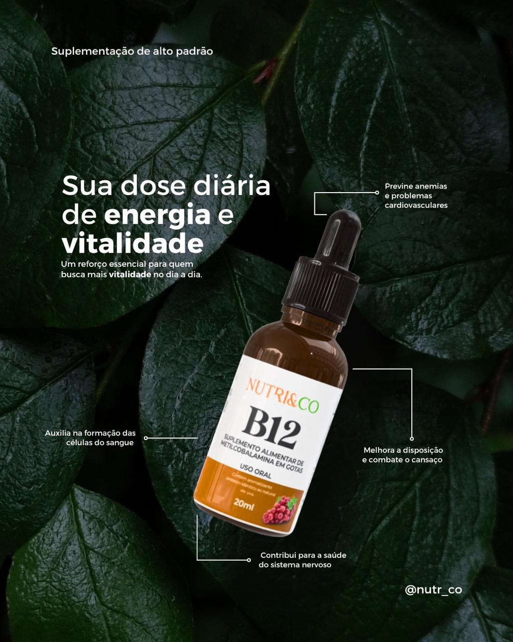 A vitamina b12 é hidrossolúvel, disponível na dieta humana por meio de alimentos de origem animal, é responsável por formação dos glóbulos vermelhos, função neurológica e síntese de DNA. A deficiência desta pode desencadear acometimentos hematológicos, neurológicos (formigamento mãos e pés) e cardiovasculares. A suplementação da b12 pode ser realizada como forma de profilaxia dos sintomas, no tratamento de deficiência de grau leve